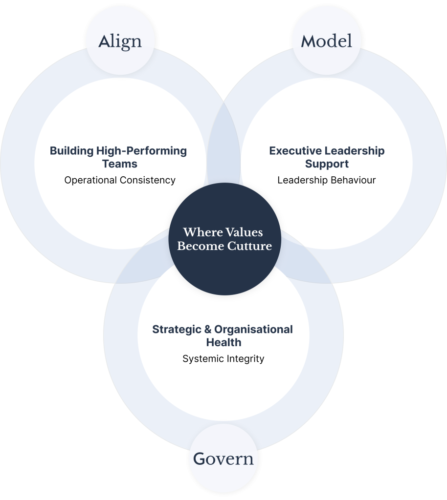 Where we apply the Align, Model, Govern framework to embed values into leadership, systems, and everyday decisions.